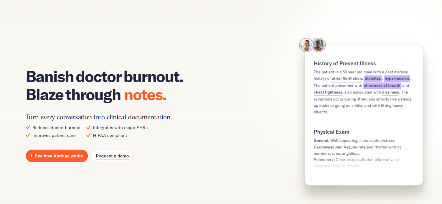 1. Helping providers focus on patients and reduce time spent on documentation. Providers who use Abridge currently save two hours per day on average, and deep integration into their Epic workflows will create additional time-saving opportunities. Deeply integrated EHR tools take up to 75% less time for a physician to use than an external app or web site.