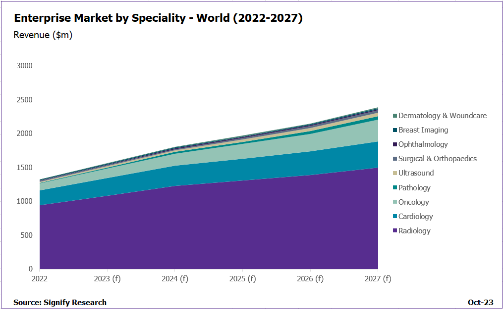 This graph represents the global market revenue from each of these specialties associated with enterprise imaging deals, as opposed to standalone deals. (f) denotes forecast data. This data is taken from our Market Opportunities of Enterprise Imaging – 2023 report, published October 2023.